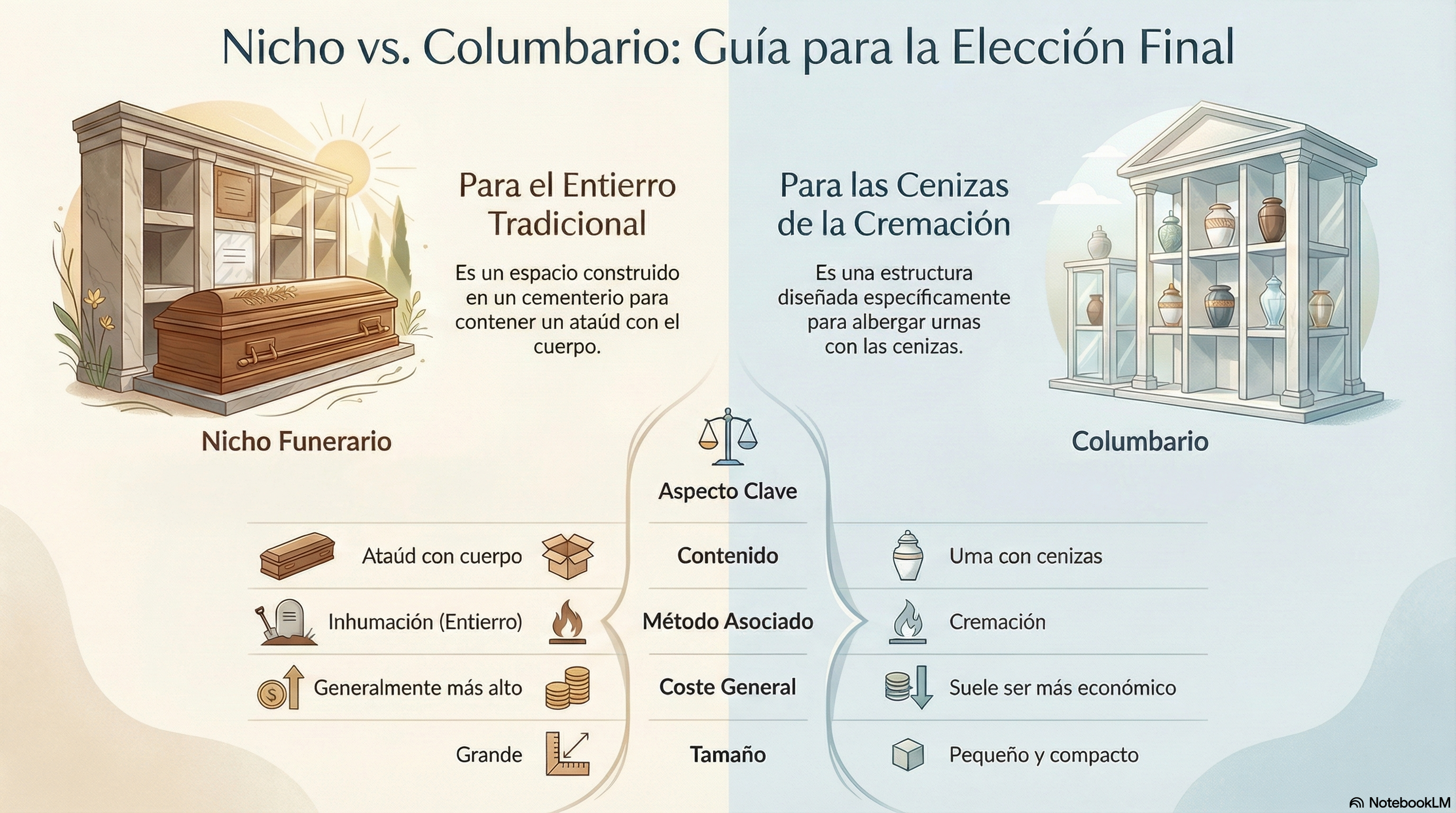 La elección entre un nicho y un columbario depende de varios factores personales, culturales y económicos. Aquí te dejamos algunos aspectos que puedes considerar: